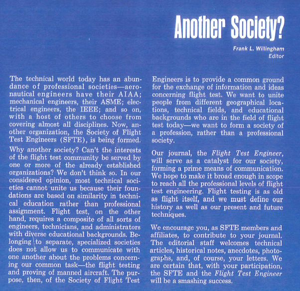 Many of the things said at the genesis of our Society apply today, especially this: “The purpose of the SFTE is to provide a common ground for the exchange of information and ideas concerning flight test. We want to unite people from different geographical locations, technical fields, and educational backgrounds who are in the field of flight test today.”
